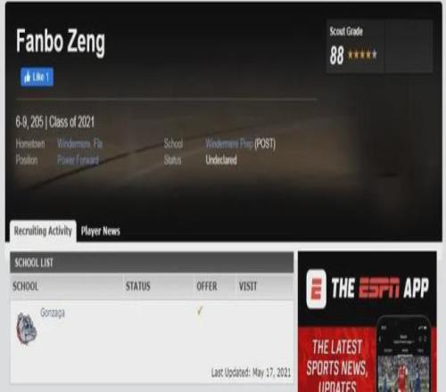首先是曾凡博,他在高中毕业被ESPN综合评分88分四星高中生,在2021届的全美大前锋球员中排名第9,当届大前锋位置排名第一的是评分97分的状元保罗-班切罗,排名第2的是97分的小帕特里克-鲍德温(被伤病所毁),排名第3的是97分的探花秀小贾巴里-史密斯,全美百大高中生排名第34位,由此可见当时曾的潜力还是非常令人期待的,他也被NCAA D1级名校冈萨加大学招募,原本有机会和切特-霍姆格伦做队友,但最终选择了一条更特殊道路,加盟新成立的发展联盟球队点燃队。