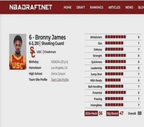 相比之下,布朗尼的选秀报告就极其详细和专业,毕竟他从小到大都有球探跟踪观察,NBA draft为他出具了非常全面的选秀报告,综合评分88分,预计选秀顺位最高47顺位,最低56顺位,也就是说即便抛去詹姆斯儿子光环,布朗尼也被球探认为是一名具备次轮秀的潜力球员,我放上他的选秀报告供大家参考。