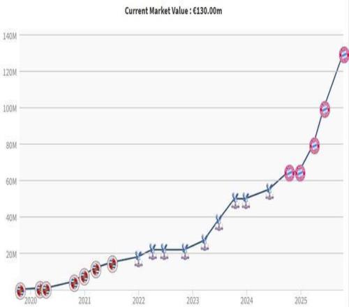 在右边锋位置,奥利塞的身价位居第三,仅落后亚马尔(2亿欧)、萨卡(1.5亿欧)。