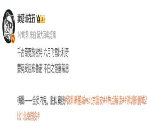 记者丰臻则是在个人社媒这样写道:“死亡赛程第一场直接赢了,最悲观的深圳突然最乐观了。深圳新鹏城是一支神奇的球队,去年只干了一件事,平申花。今年只干了两件事,赢申花赢国安。但是国安比新鹏城更神奇八千倍。”