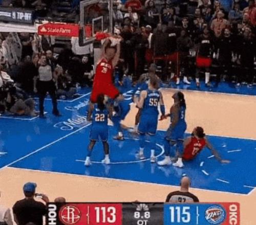 第一个加时赛,火箭继续与雷霆展开对轰,照样打到关键时刻,申京自投自抢用砸扣将比分追平115-115,成功把比赛拉进第二个加时赛。