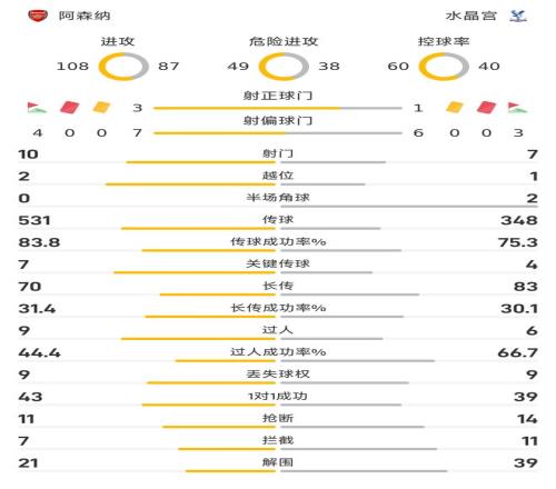 控球率方面,阿森纳达到60%,水晶宫则为40%。传球数据方面,阿森纳全场531次传球,其中包含7次关键传球,传球成功率83.8%;反观水晶宫全场348次传球,其中包含4次关键传球,传球成功率75.3%。