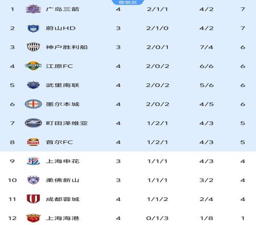 最新积分榜方面,随着武里南联取胜,中超的3支球队都被挤出前8。上海海港4轮1平3负成为东亚区唯一一支还未取胜的球队,仅积1分仍旧排在积分榜垫底。成都蓉城积4分跌到倒数第2,两队包揽了最后两名。还未出战的申花跌出前8,暂时排在第9。